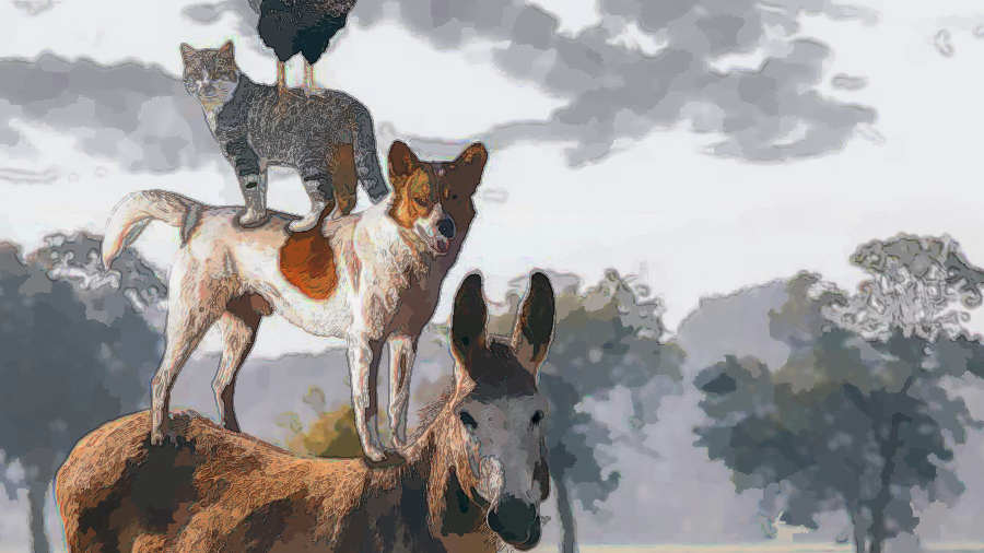 The four companions consulted together and made a plan to frighten away the robbers. The donkey put his front feet up on the windowsill, the dog mounted on the donkey’s back, the cat mounted on the dog’s back, and the rooster flew up on to the cat.
